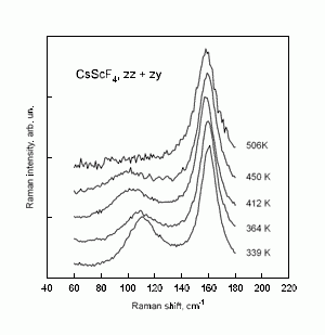 С использованием разработанной ранее установки регистрации спектров комбинационного рассеяния в условиях сильных шумов выполнены исследования динамики решетки кристалла CsScF4 в широком интервале температур и давлений. Обнаружена конденсация мягкой фононной моды при высокотемпературном переходе между тетрагональными фазами (показана на рисунке), найден новый фазовый переход в низкосимметричную фазу высокого давления. На основании проведенного предварительного анализа сделаны предположения о возможной симметрии и структуре этой фазы.