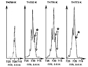 Типичная картина в области масс с m/е = 717-725 а.е.м. показана на рис. 2. Для C59B определены давление насыщенного пара и параметры сублимации. Определено, что C59В имеет большую энтальпию сублимации по сравнению с C60, что можно объяснить наличием у первого дипольного момента. Оценки, проведенные методами квантовой механики, позволили определить его величину, которая составила - 0.75 D.