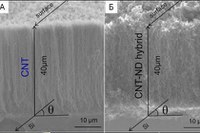 Материал представляет собой прочно связанную конструкцию из вертикально стоящих графеновых нанотрубок, на поверхность которых нанесен слой наноалмазов.