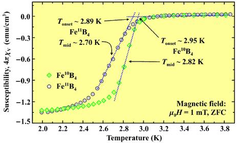 Верхнее критическое поле составило Нс2(0) = 1.05 Тл. Изотопическое замещение атомов бора приводит к изменению Тс, то есть сверхпроводимость, как и ожидалось, имеет фононную природу, что необычно для соединений железа. FeB4 оказался очень прочным материалом: его твердость (62 ГПа) достаточна для конструирования новых сверхпроводниковых наноэлектромеханических систем.