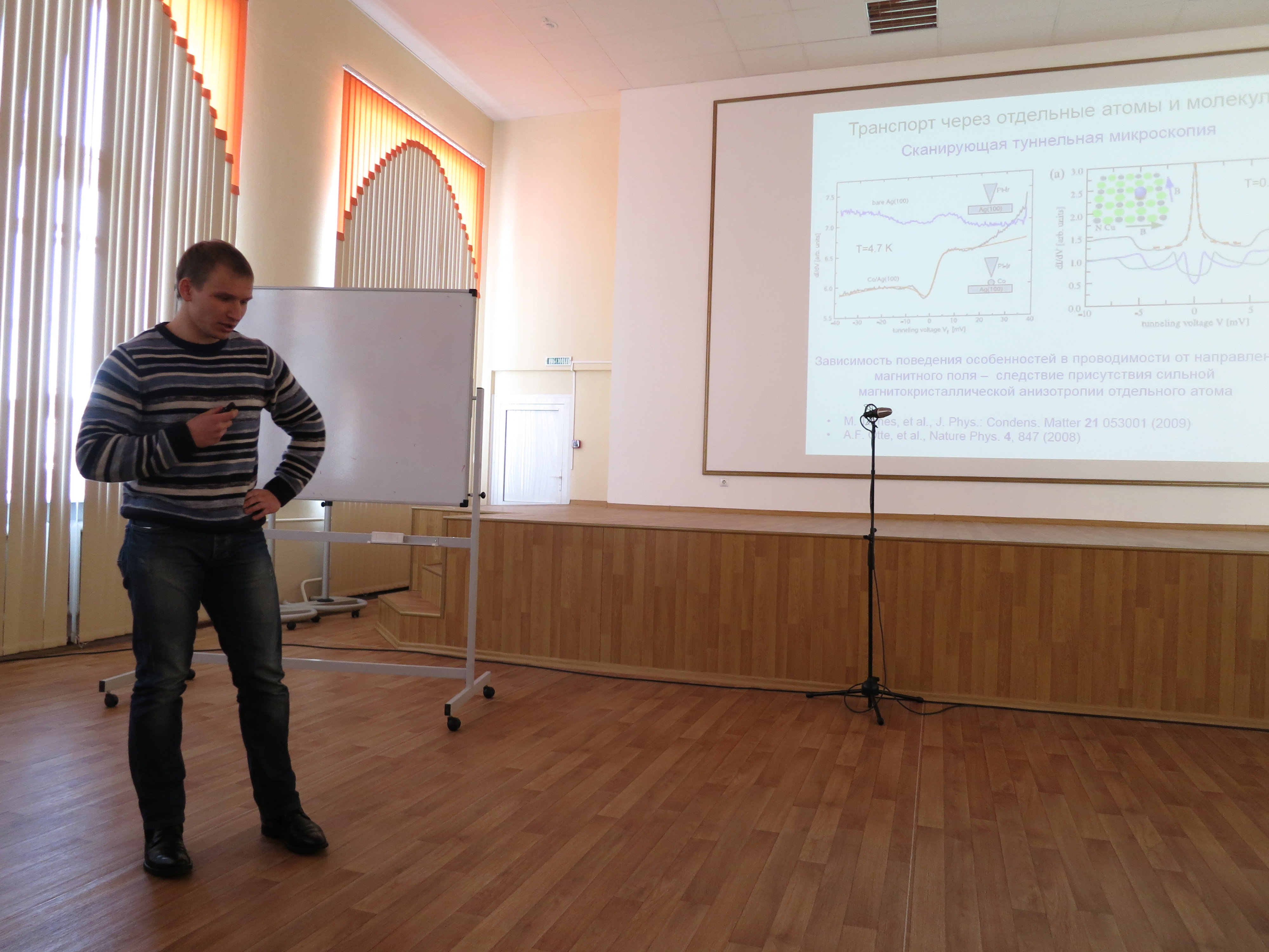 Сергей Аксенов, старший научный сотрудник лаборатории теоретической физики Института физики им. Л.В. Киренского Сибирского отделения Российской академии наук (ИФ СО РАН), на конкурсе-конференции молодых ученых Красноярского научного центра СО РАН в 2013 году с докладом "Транспорт через отдельные атомы и молекулы. Сканирующая туннельная микроскопия". Красноярск.