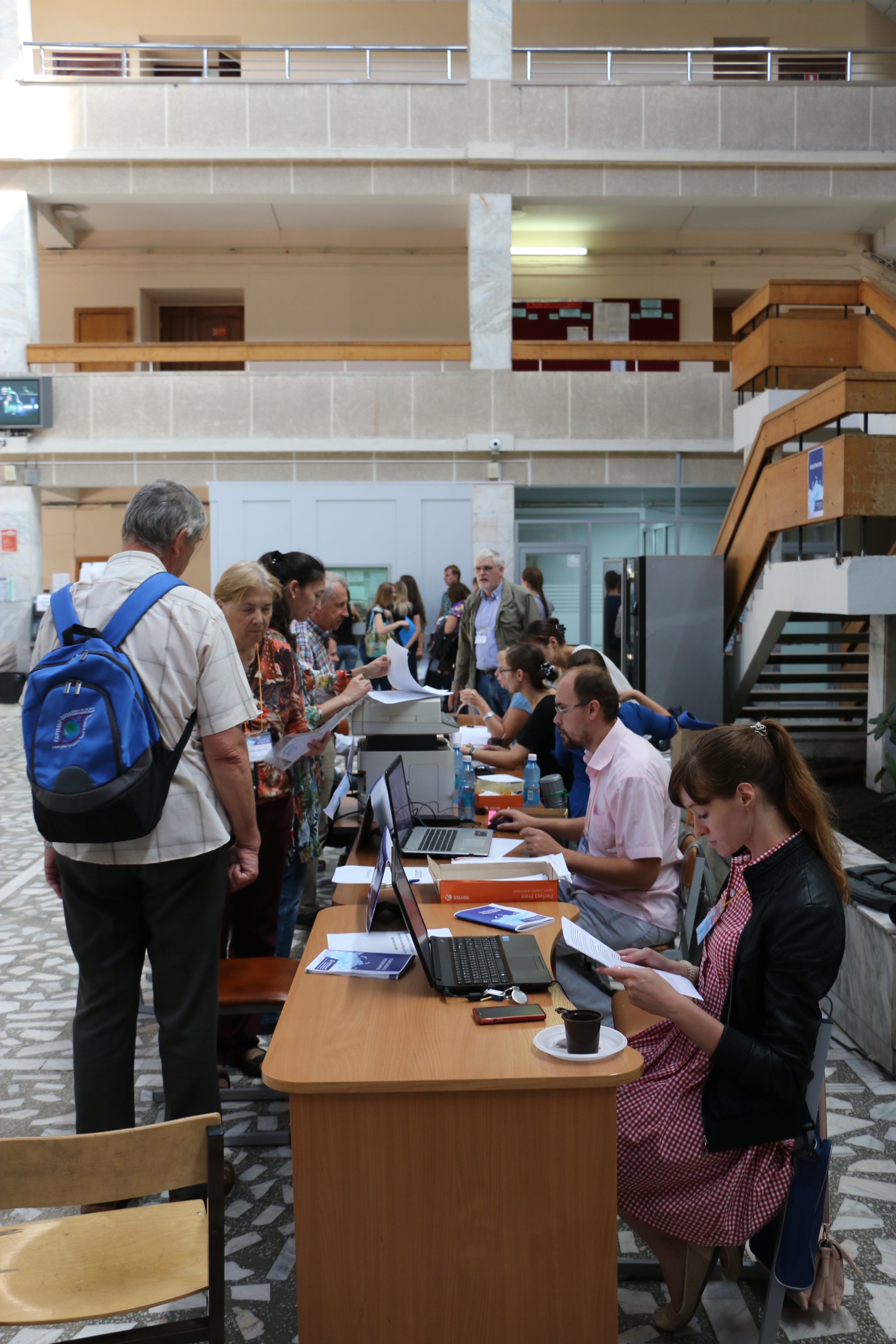 Регестрация участников Евро-Азиатского симпозиума "Прогресс в магнетизме" (EASTMAG -2016) в Красноярске в конгресс-холле Сибирского федерального университета (СФУ). Симпозиум был организован и проведен Институтом физики им. Л.В. Киренского Сибирского отделения Российской академии наук (ИФ СО РАН). За столом регистрации (справа) Евгения Мошкина и Дмитрий Петров, сотрудники лаборатории физики магнитных явлений института. Август 2016 года.