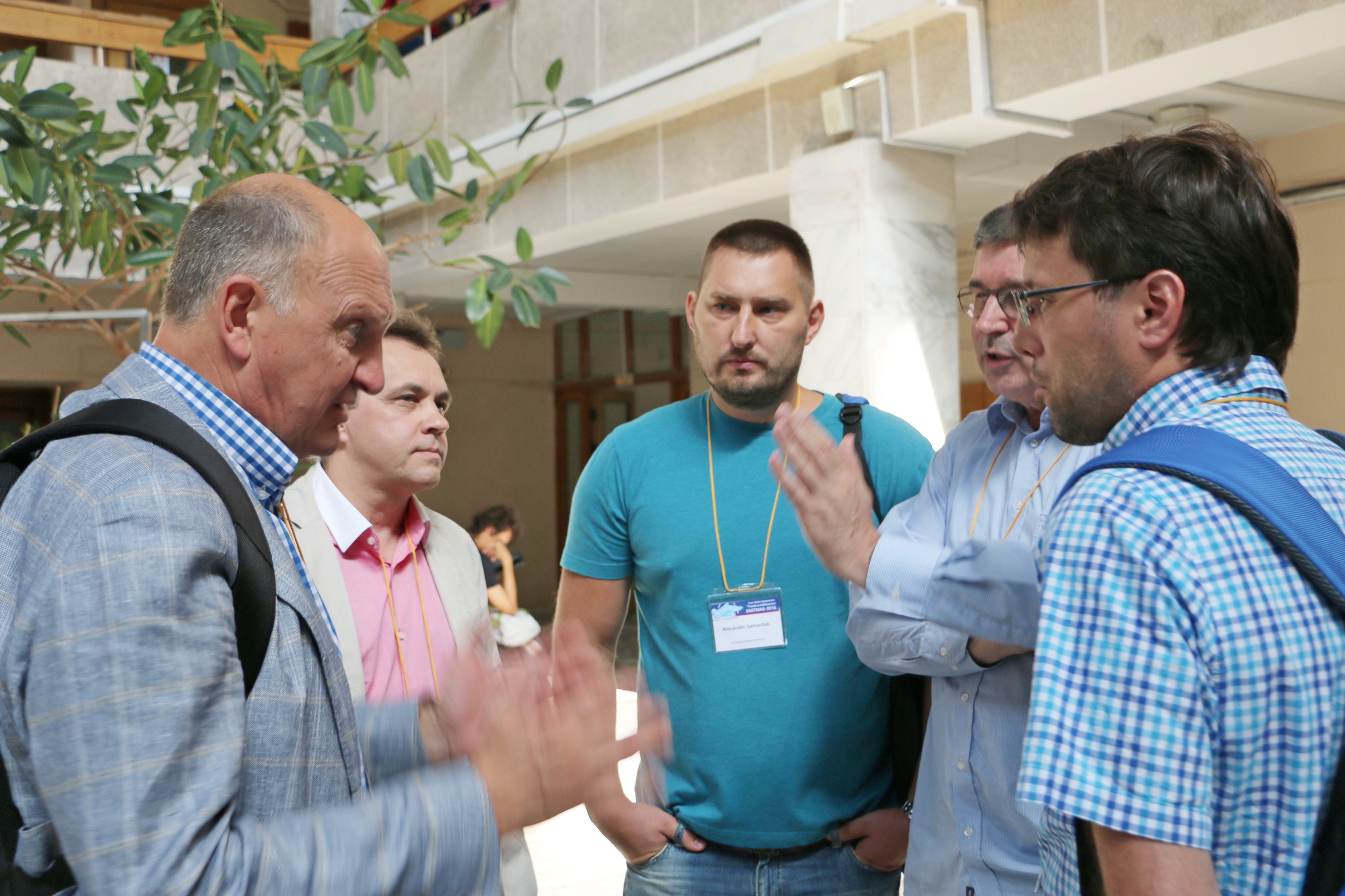 Участники Евро-Азиатского симпозиума "Прогресс в магнетизме" (EASTMAG-2016), организованного и проведенного в Красноярске. Во время перерыва заседания, слева направо: С.А. Никитов, Н.В. Волков, А. Самардак, А.А. Саранин. Красноярск. Конгресс-холл Сибирского федерального университета (СФУ), август 2016 года.