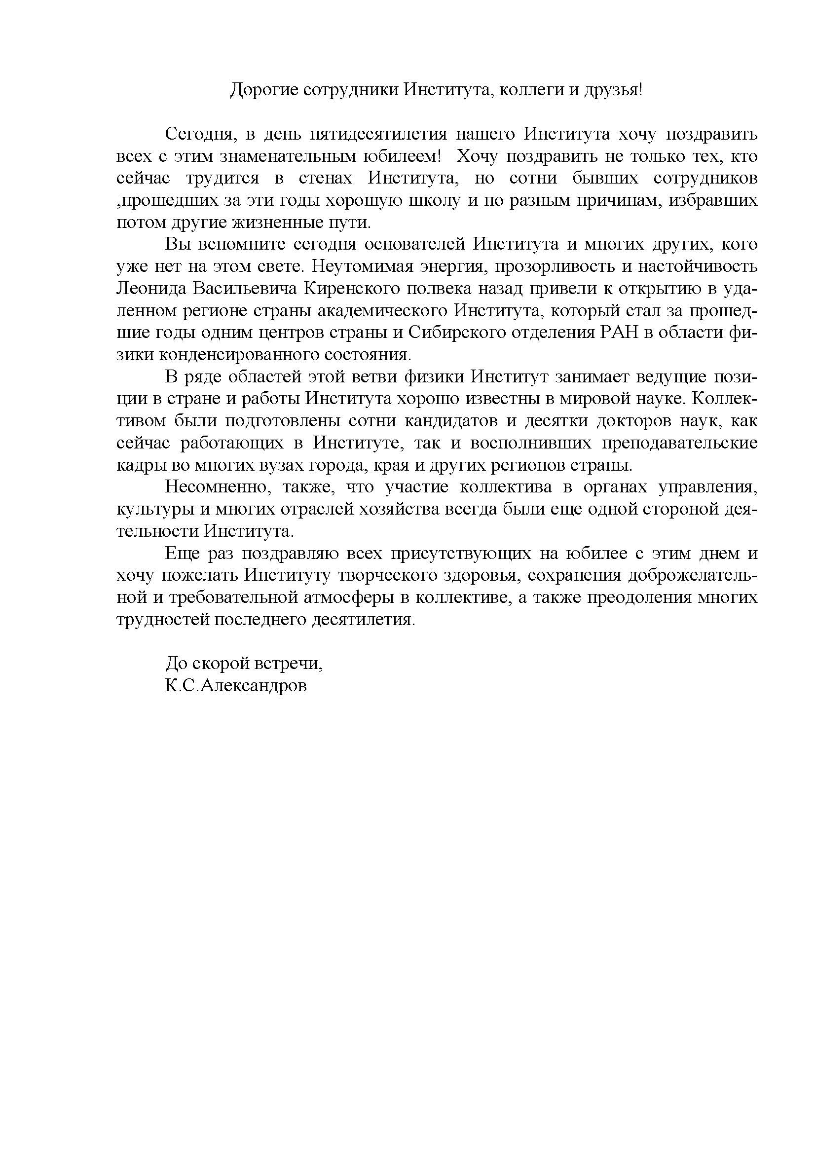 Вы здесь: Главная / Документы / Поздравления с 50-летием Института / Академик Александров К.С.