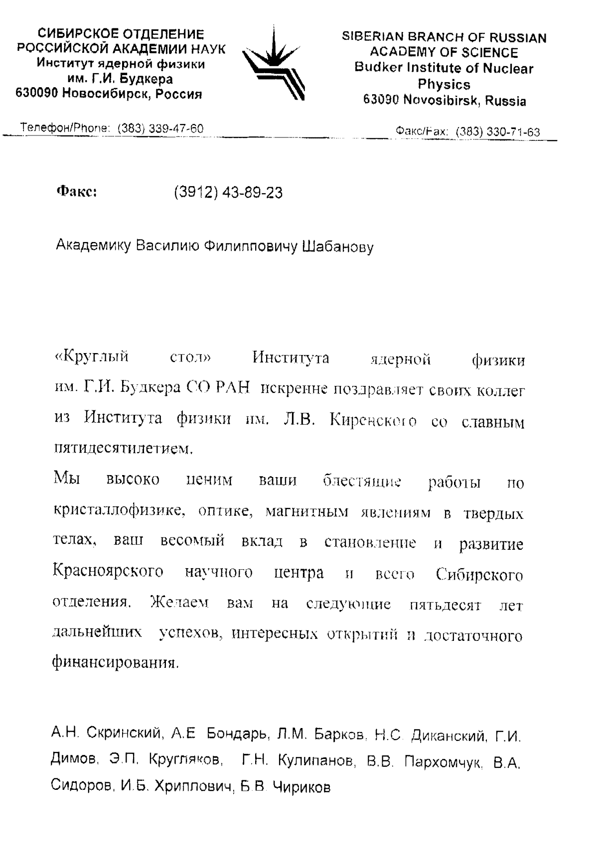 Вы здесь: Главная / Документы / Поздравления с 50-летием Института / Институт Институт ядерной физики им. Г.И. Будкера СО РАН