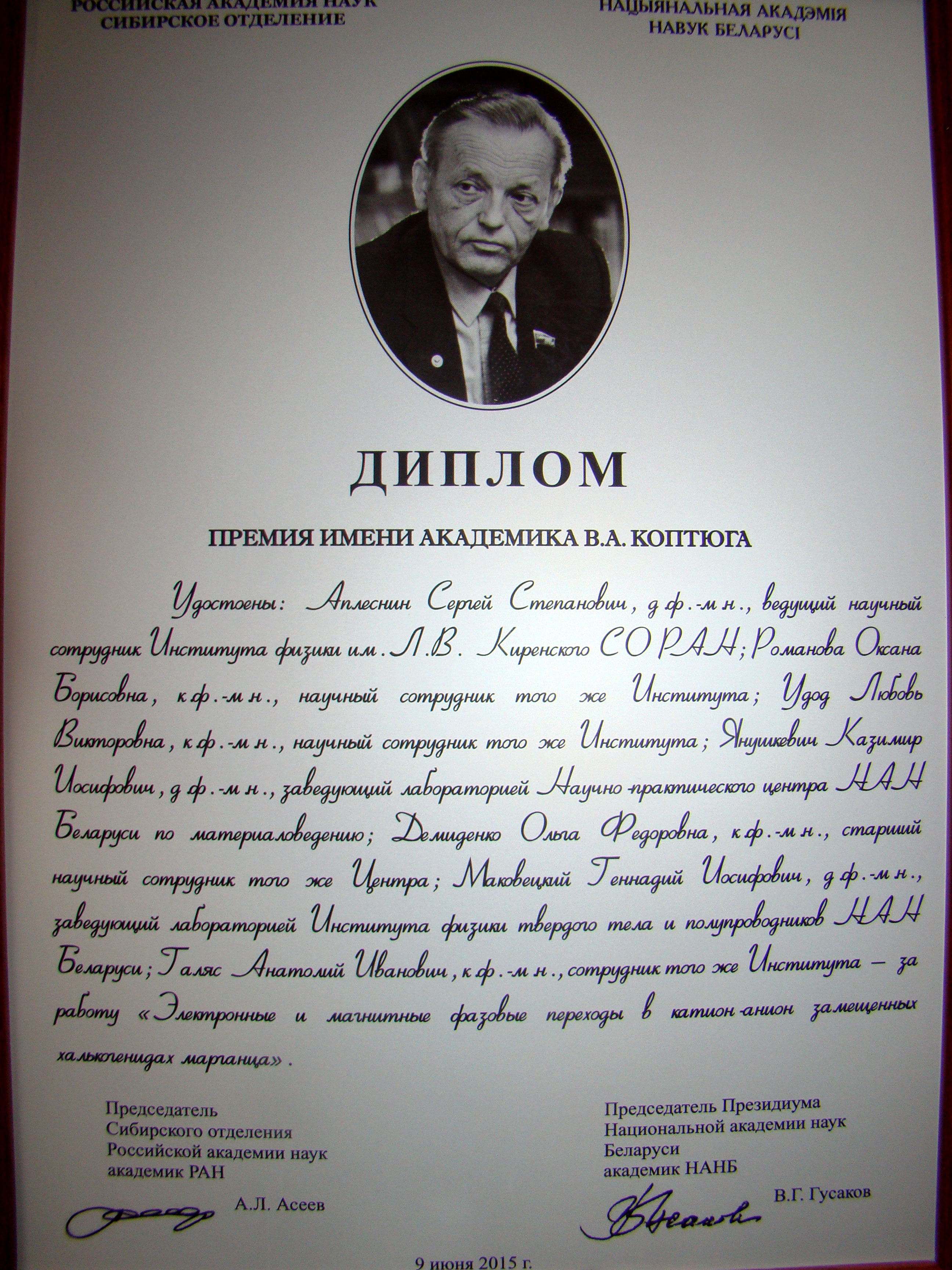 Вы здесь: Главная / Документы / doc / Диплом премии им. академика В.А. Коптюга