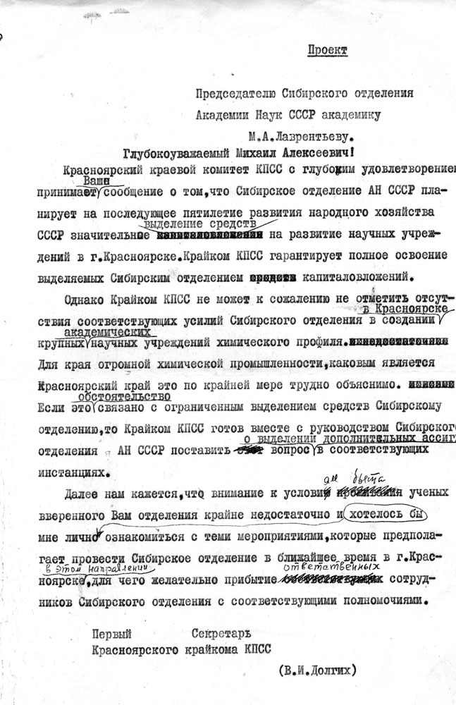 Проект письма от Долгих В. И. к Лаврентьеву М. А.