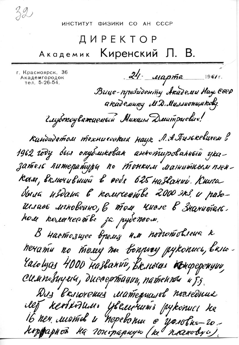 Вы здесь: Главная / Документы / Переписка Л. В. Киренского / Письма Л. В. Киренского / Вице-президенту АН СССР М. Д. Миллионщикову