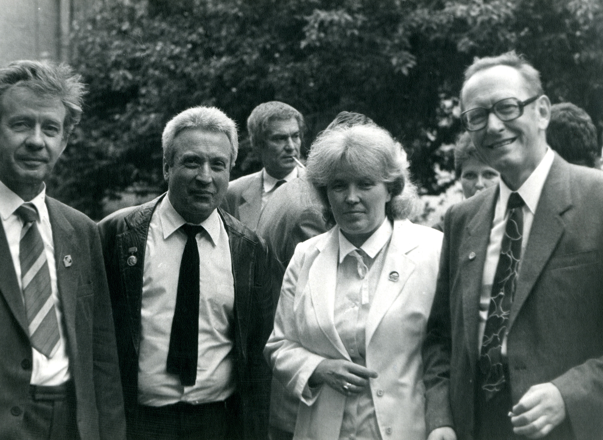 Академик Александров К.С. (крайний справа), директор Института физики им. Л.В. Киренского Сибирского отделения Академии наук СССР (ИФ СО АН СССР), на праздновании 100-летия Ленинградского государственного электрофизического института им. В.И. Ульянова, который он окончил с отличием в 1954 году. Фото 1986 года, Ленинград.