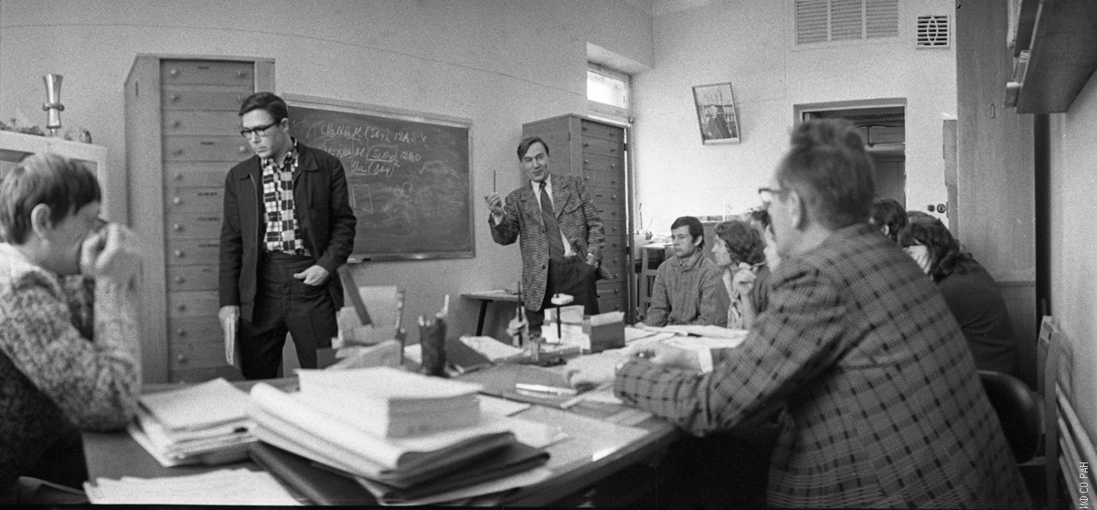 Принцип организации и роста исследовательских групп в лабораториях и преобразование их в самостоятельные лаборатории - являлся основой развития и плодотворной деятельности института. Некоторым исключением из правил явилась организация в институте лаборатории кристаллофизики. В начале 1958 года в Красноярск по приглашению приехал кандидат физико-математических наук, специалист в области кристаллофизики, ученик академика А.В. Шубникова, молодой, но уже сложившийся ученый К.С. Александров. В институте он организовал исследовательскую группу, которая уже в 1959 году была преобразована в лабораторию кристаллофизики, которой Александров руководил до 2003 года. Семинар лаборатории кристаллофизики. На переднем плане А.И. Крупный, у доски А.Т. Анистратов, фото 1973 год.