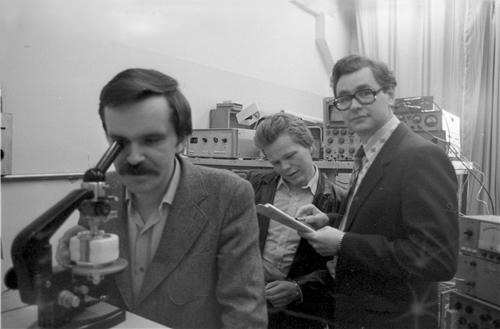 Сотрудники лаборатории молекулярной спектроскопии Института физики им. Л.В. Киренского Сибирского отделения Академии наук СССР (СО АН СССР), победители конкурса научных работ СО АН СССР среди молодых ученых 1983 года, слева направо: Жуйков В.А., Зырянов В.Я., Аверьянов Е.М. Снимок 1983 года. Красноярск.