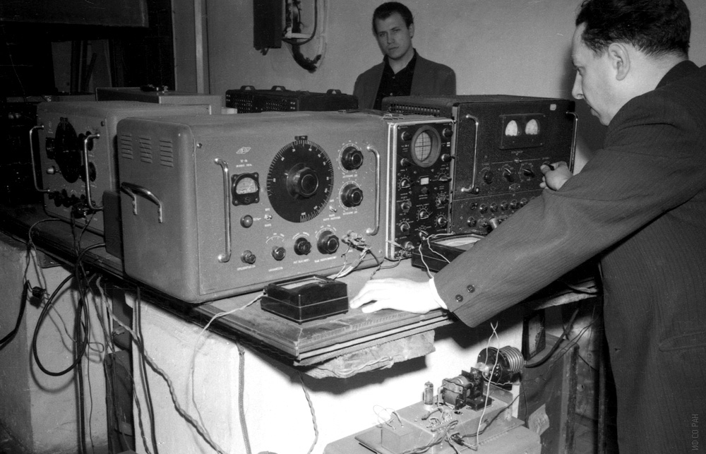 Габуда С.П. (слева), сотрудник Института физики Сибирского отделения Академии наук СССР (ИФ СО АН СССР) и Лундин А.Г., руководитель группы ядерно-магнитного резонанса Сибирского технологического института, у блока управления и настройки спектрометра ядерно-магнитного резонанса (ЯМР). Фото 1959 года. Красноярск.