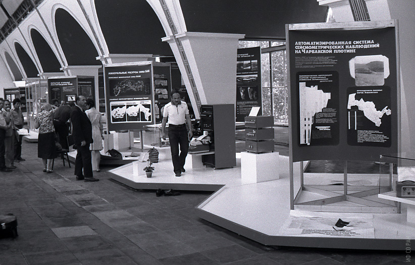 Зайцев Николай Кондратьевич (на подиуме), научный сотрудник лаборатории эмиссионной спектроскопии Института физики им. Л.В. Киренского Сибирского отделения Академии наук СССР (ИФ СО АН СССР), в Москве на выставке достижений народного хозяйства (ВДНХ), фото 1984 года.