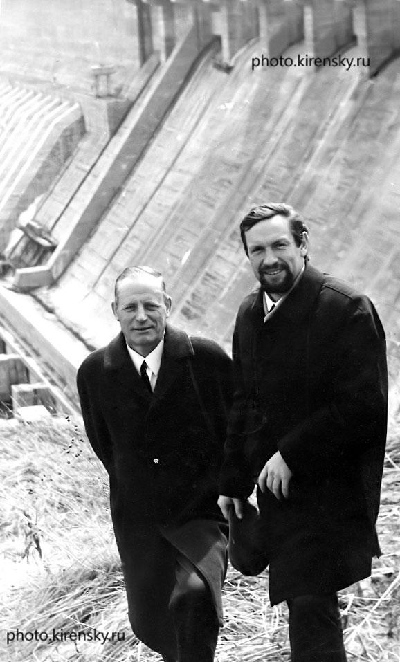1976 год. Апарин В.П. (справа), сотрудник лаборатории геомагнитных исследований Института физики им. Л.В. Киренского Сибирского отделения Академии наук СССР (ИФ СО АН СССР), с гостем института на Красноярской ГЭС. Дивногорск.