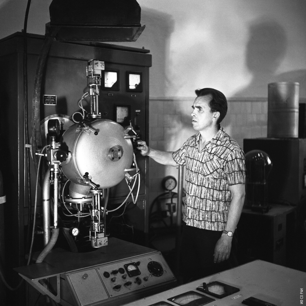 1969 год. Безносиков Б. В., младший научный сотрудник лаборатории кристаллофизики Института физики им. Л.В. Киренского Сибирского отделения АН СССР, у установки для выращивания кристаллов из расплавов. Красноярск.