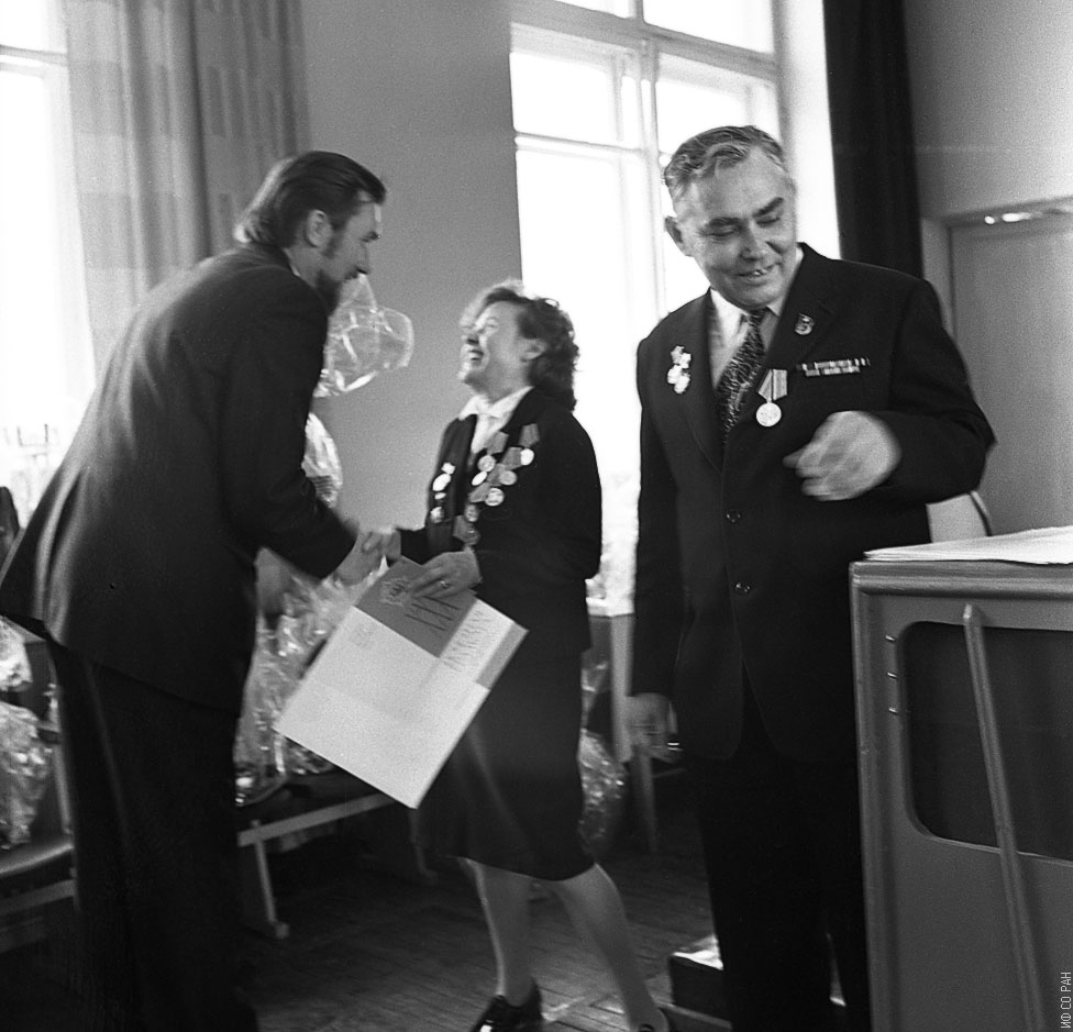 В конференц-зале Института физики им. Л.В. Киренского Сибирского отделения Академии наук СССР (ИФ СО АН СССР) 9 мая 1975 года в День Победы в Великой Отечественной войне (1941-1945 гг.). Ветерана войны Смолянинову А. П. поздравляет заведующий лабораторией физики магнитных явлений института Чистяков Н. С. и директор института Терсков И.А. (справа).