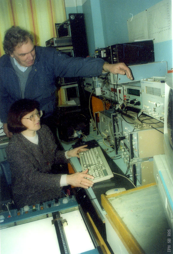 2000 год. Н.А. Дрокин, старший научный сотрудник лаборатории электродинамики и СВЧ электроники Института физики им. Л.В. Киренского Сибирского отделения Российской академии наук (ИФ СО РАН) и М.И. Никитина за установкой для измерения импеданса. Красноярск.