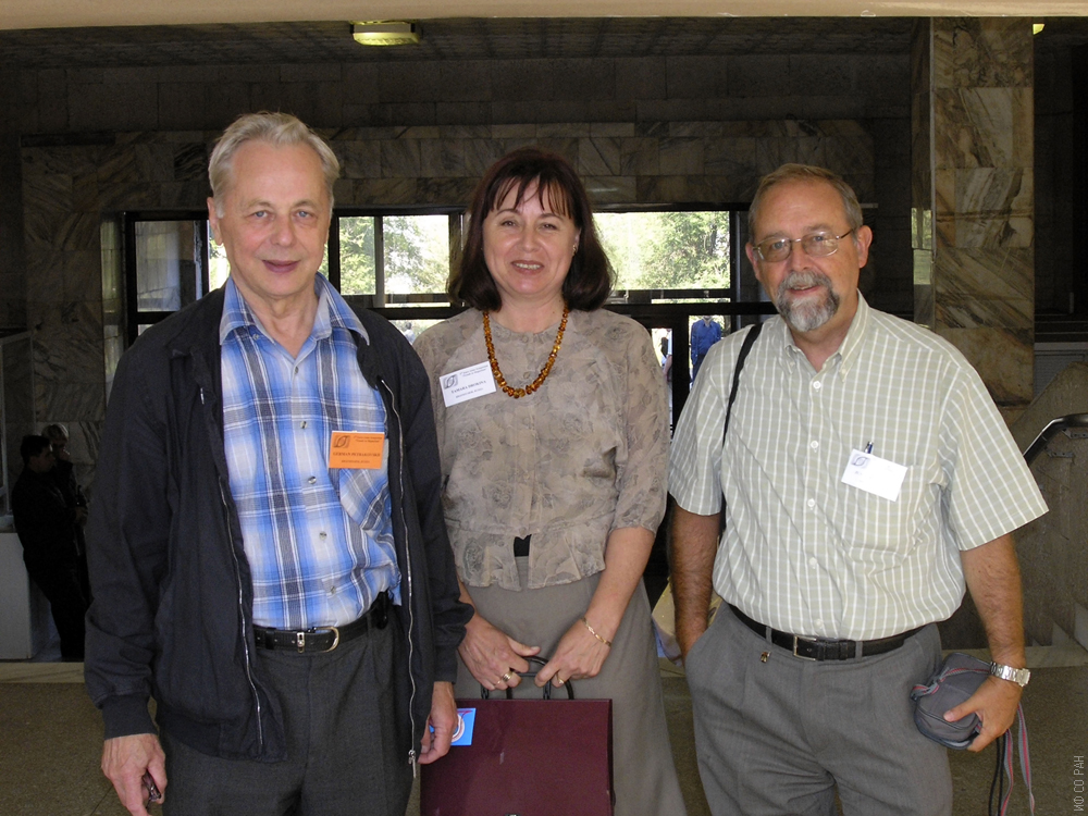 Фото на память. Участники Евро-Азиатского симпозиума «Прогресс в магнетизме» (ЕASTMAG-2004), сотрудники Института физики им. Л.В. Киренского Сибирского отделения Российской академии наук (ИФ СО РАН), слева направо: Петраковский Г. А., Дрокина Т. В., и Дж. Бартоломе (университет Сарагосы, Испания), Красноярск, август 2004 год.