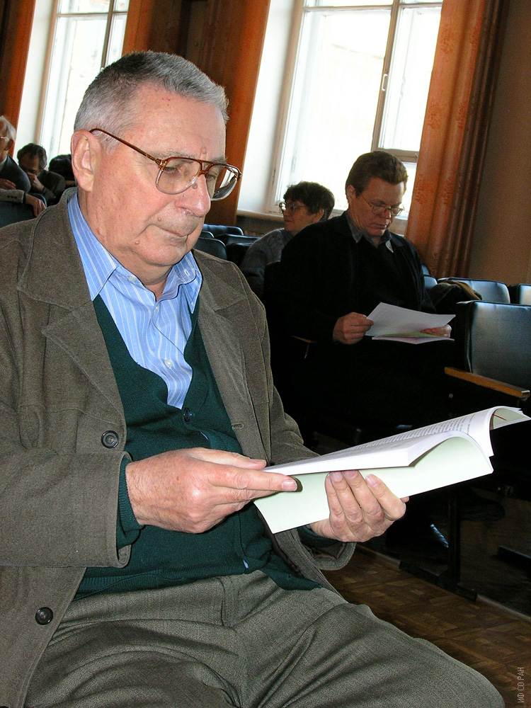 Игнатченко Вальтер Алексеевич (слева), главный научный сотрудник лаборатории теоретической физики и Зырянов Виктор Яковлевич, заведующий лабораторией молекулярной спектроскопии Института физики им. Л.В. Киренского Сибирского отделения Российской академии наук, на семинаре в конференц-зале института, фото 2015 года. Красноярск.