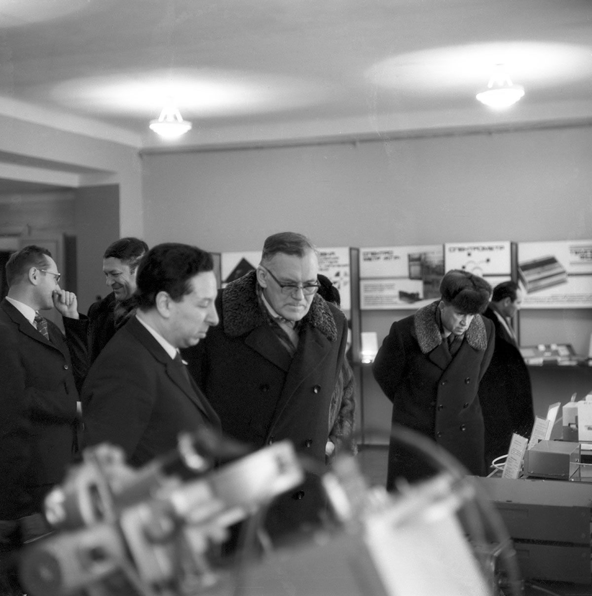 1969 год. К посещению Института физики Сибирского отделения Академии наук СССР (ИФ СО АН СССР) заместителем председателя Государственного комитета СССР по науке и технике Кириллиным В.А. и первым секретарем Красноярского краевого комитета коммунистической партии Советского Союза Федирко П.С. была организована выставка в холле института. На переднем плане Лундин А.Г., заместитель директора института по научной работе (слева) и Кириллин В.А. За ними: Александров К.С. (слева) и Федирко П.С. Красноярск.