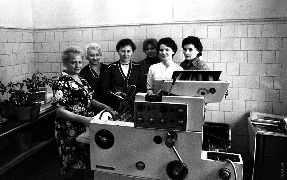 Коллектив печатного цеха Института физики им. Л.В. Киренского Сибирского отделения Академии наук СССР (ИФ СО АН СССР). Слева направо: Пшаничная Тамара Алексеевна, Максименко Зинаида Евдокимовна, Стутко Мария Ивановна, Чеснокова Валентина Николаевна, Стутко Татьяна Николаевна, Старостина Ольга Ивановна, снимок 1985 года. Красноярск.