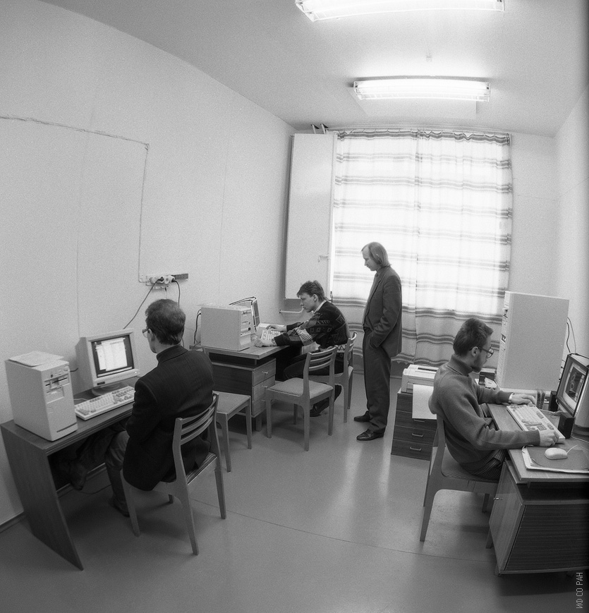 1995 год. Первый компьютерный класс в Институте физики им. Л.В. Киренского Сибирского отделения Российской академии наук (ИФ СО РАН). В центре (стоит) ученый секретарь института Александр Николаевич Втюрин, на заднем плане Андрей Геннадьевич Агеев, на переднем плане слева Константин Николаевич Пичугин. Красноярск.