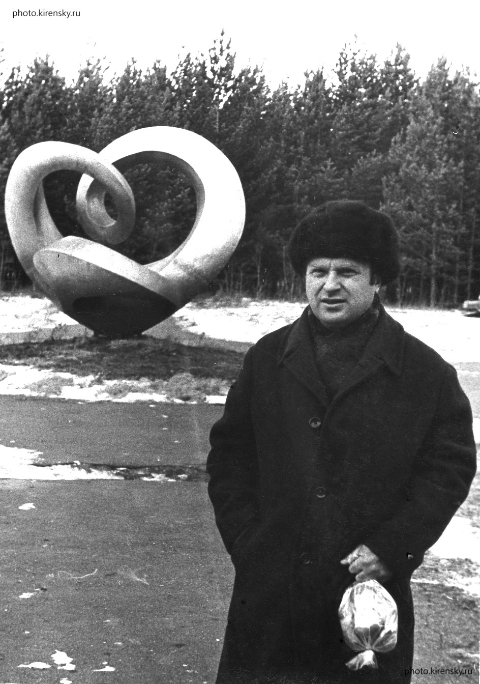 1972 год. Куденко Юрий Абрамович, старший научный сотрудник теоретического отдела Института физики им. Л.В. Киренского Сибирского отделения Академии наук СССР у скульптуры «Соленоид». Скульптура установлена напротив здания института в 1969 году. Идея символа института принадлежит организатору и первому директору института академику Л. В. Киренскому, а исполнена скульптором Н.А. Силисом.