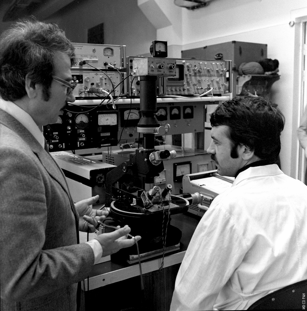 Фролов Георгий Иванович (слева) и Рейнгард Александр Ефремович, сотрудники лаборатории физики магнитных пленок Института физики им. Л.В. Киренского Сибирского отделения Академии наук СССР (ИФ СО АН СССР), за обсуждением результатов эксперимента, снимок 1990 года. Красноярск.