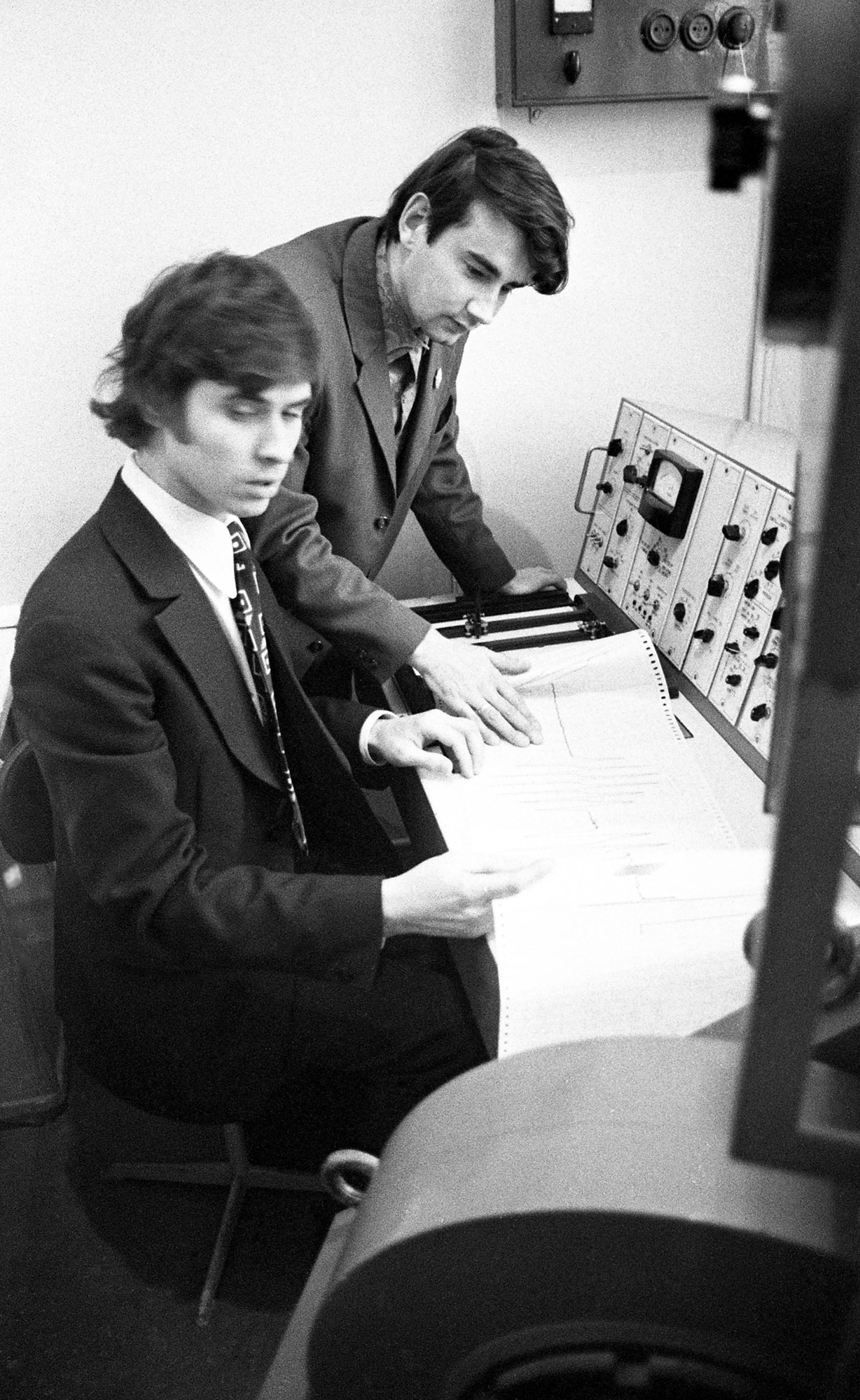 Сотрудники лаборатории радиоспектроскопического структурного анализа Института физики им. Л.В. Киренского Сибирского отделения Академии наук СССР (ИФ СО АН СССР) Иванов Ю.Н. (слева) и Серышев С.А., за пультом ЯМР спектрометра, фото 1982 года. Красноярск.
