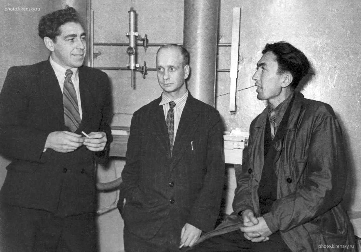 1959 год. На снимке первые сотрудники лаборатории физики магнитных явлений Института физики Сибирского отделения Академии наук СССР (ИФ СО АН СССР). Слева направо: Лаптей Д.А., Савченко М.К., Черкашин В.С. Красноярск.