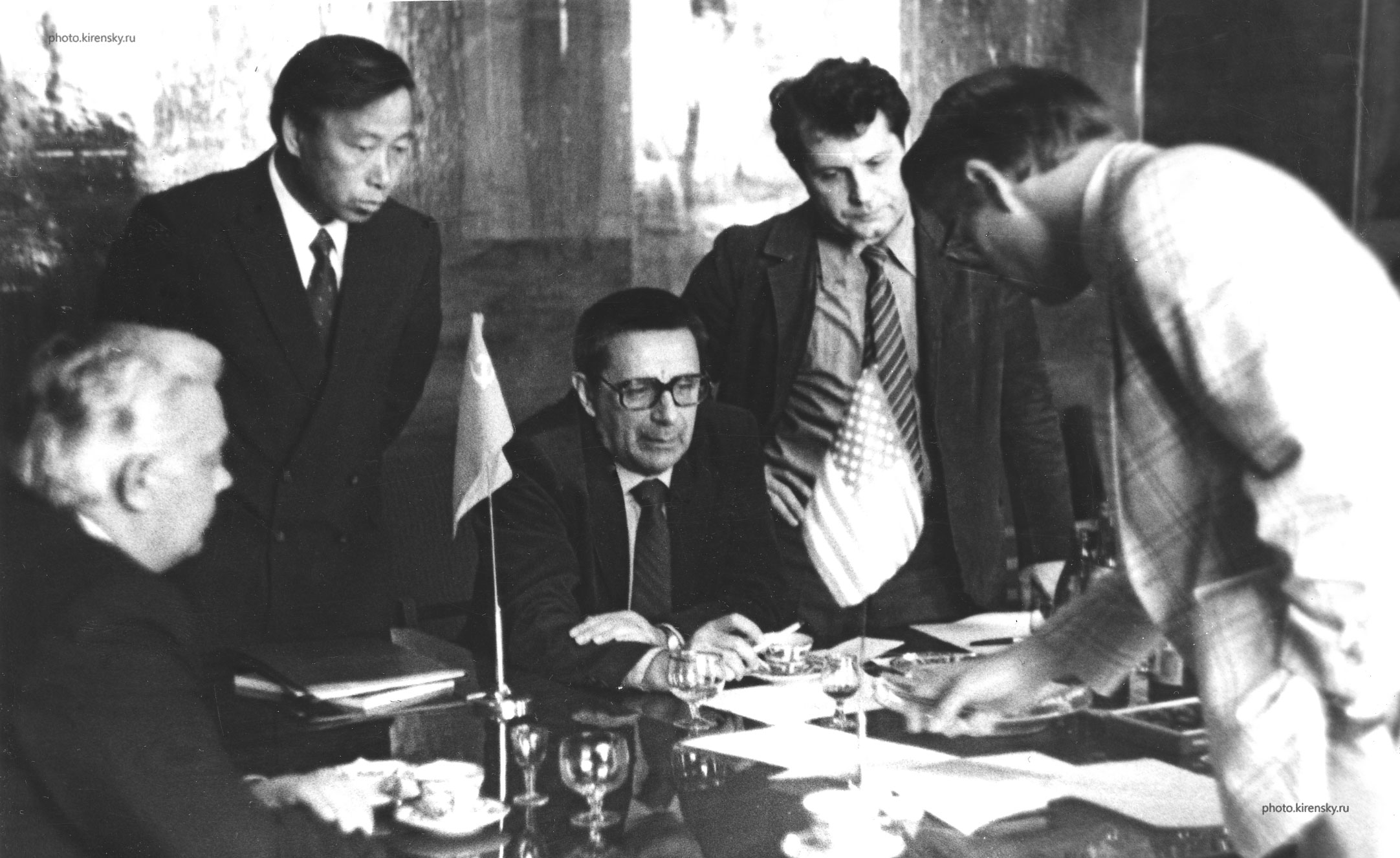 Снимок сделан в Иркутске на Международном симпозиуме (коллоквиуме) по физике магнитных пленок в 1968 году. Такой симпозиум был организован и проведен Институтом физики Сибирского отделения Академии наук СССР (ИФ СО АН СССР) совместно с Иркутским государственным педагогическим институтом по поручению Совета Министров СССР по науке и технике. Он был первым в СССР и третьим в мире. В Красноярске он не мог быть проведён, поскольку город был закрыт для зарубежных учёных. Слева направо: Руссов Глеб Иванович, ректор Иркутского государственного пединститута, Ким Петр Дементьевич, сотрудник Института физики, Игнатченко Вальтер Алексеевич, руководитель теоретического отдела Института физики, Захаров Юрий Владимирович, учёный секретарь Института физики