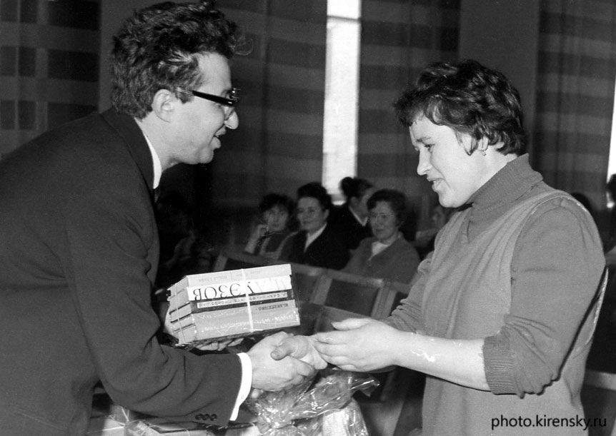 8 марта 1973 год. . В актовом зале Института физики им. Л.В. Киренского Сибирского отделения Академии наук СССР (ИФ СО АН СССР) торжественное заседание, посвященное Международному женскому дню 8 марта. Подарок Н.В. Носковой, сотруднику экспериментальных механических мастерских института, вручает: Р.Г. Хлебопрос, председатель профсоюзного комитета института. Красноярск.