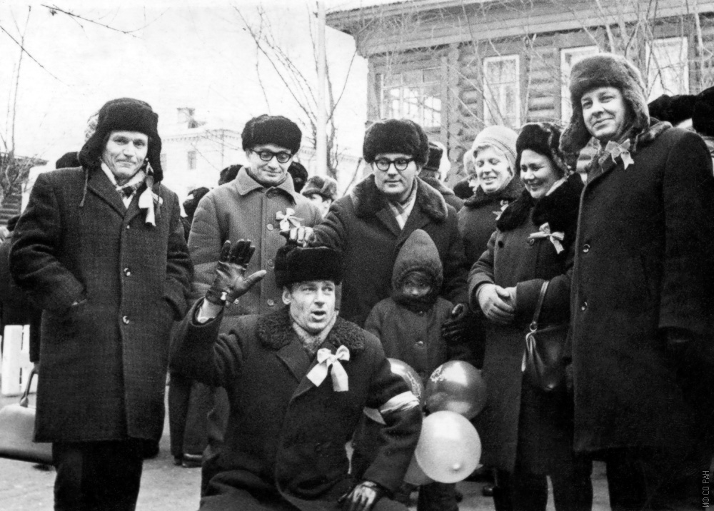 7 ноября 1972 года на демонстрации, посвященной годовщине Октябрьской революции, сотрудники лаборатории молекулярной спектроскопии Института физики им. Л.В. Киренского Сибирского отделения Академии наук СССР (СО АН СССР с 1991 года - СО РАН). Слева направо: Жидков Л. Г., Шабанов В. Ф., Федоров В. П., Аксенова Г. С., Юдина В. Г., Бондарев А. Ф. На корточках Спиридонов В. П. Красноярск.