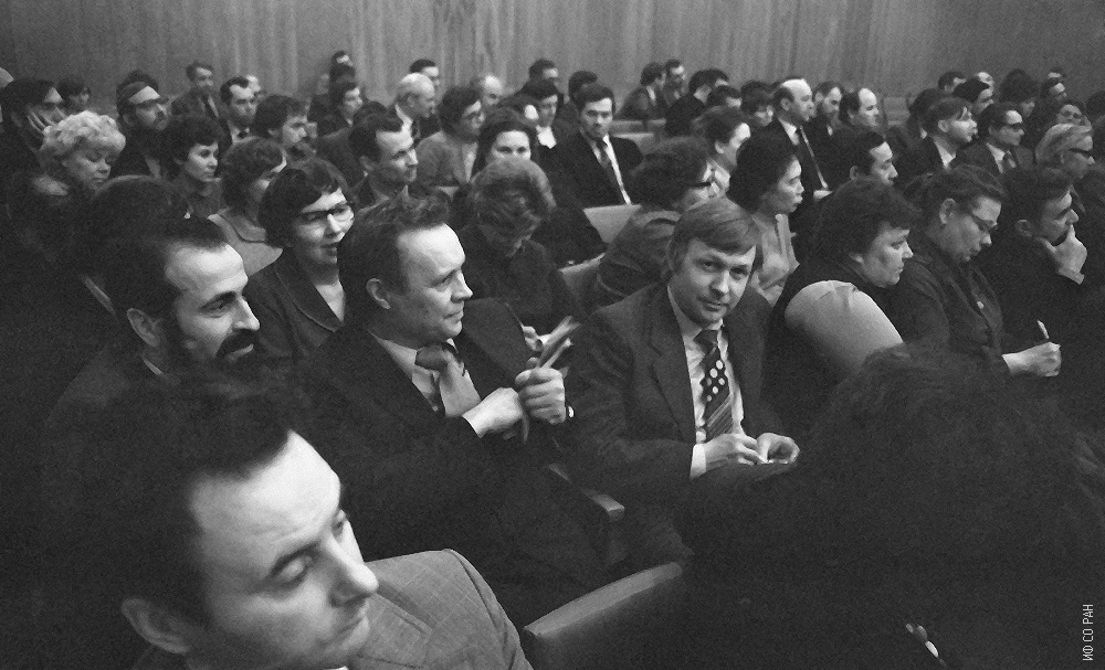 1986 год. Научные чтения, посвященные памяти академика Л.В. Киренского, организатора и первого директора Института физики Сибирского отделения Академии наук СССР (ИФ СО АН СССР), с участием сотрудников институтов Красноярского Научного центра СО АН СССР и жителей Академгородка. Во втором ряду (слева направо) Фиш А.М., Хрусталёв Б.П., Степанов Г.Н. Красноярск.