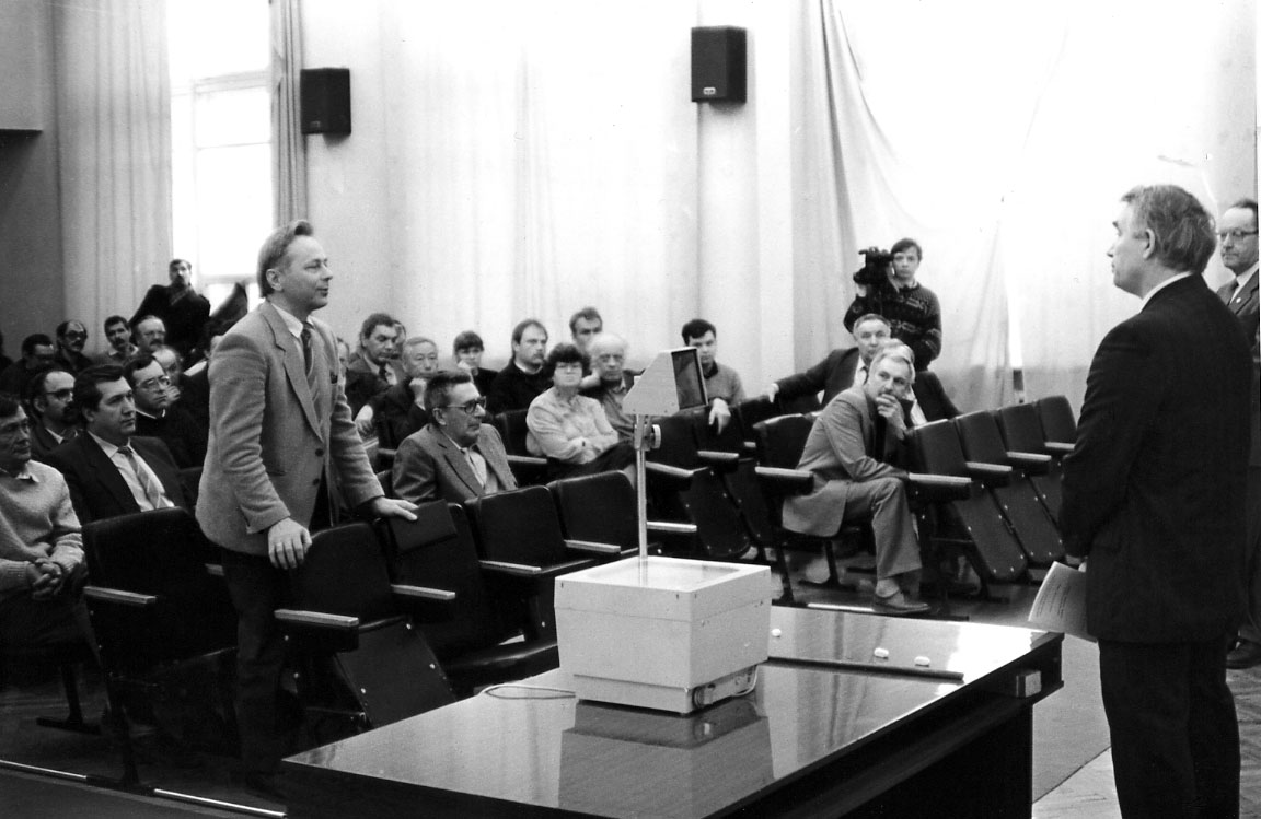 1993 год. Актовый зал Института физики им. Л.В. Киренского Сибирского отделения Российской академии наук (ИФ СО РАН). Заседание диссертационного совета. Вопрос задает Петраковский Г.А. Во втором ряду, крайний слева - Зиненко В.И., ведущий научный сотрудник лаборатории кристаллофизики ИФ. Красноярск.