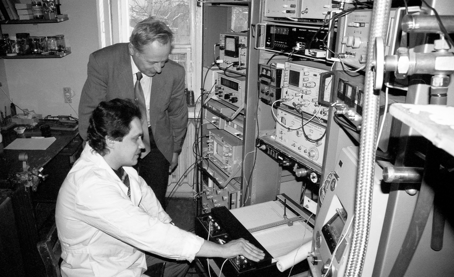 1996 год. Г.А. Петраковский (слева), заведующий лабораторией резонансных свойств магнитоупорядоченных веществ и Н.В. Волков, старший научный сотрудник лаборатории Института физики им. Л.В. Киренского Сибирского отделения Российской академии наук (ИФ СО РАН), за установкой по оптическому детектированию магнитного резонанса. Красноярск.