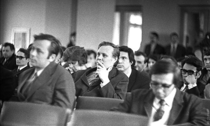1975 год. В конференц-зале Института физики им. Л.В. Киренского Сибирского отделения Академии наук СССР (СО АН СССР) (ИФ СО АН СССР с 1991 года - ИФ СО РАН), на физическом семинаре. В первом ряду, Петраковский Г. А. (слева) и Заславский Г.М., во втором ряду - Хрусталев Б. П. за ним- Даутов Ш. А. Красноярск.