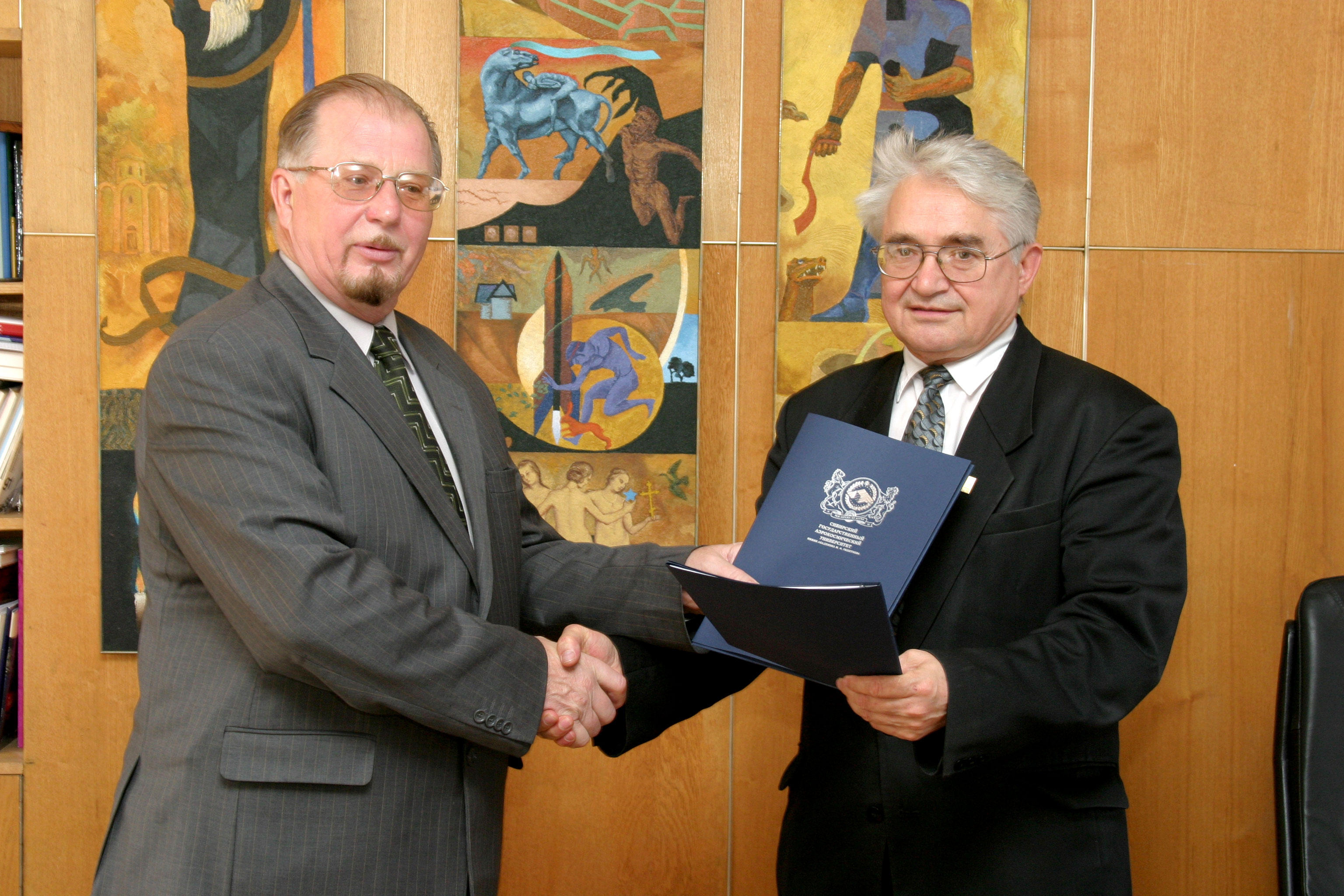 В.Ф. Шабановым, председателем Президиума Красноярского научного центра Сибирского отделения Российской академии наук, подписано соглашение с ректором Сибирского аэрокосмического университета им. академика М.Ф. Решетнёва, профессором Геннадием Павловичем Беляковым (слева). 2006 год.