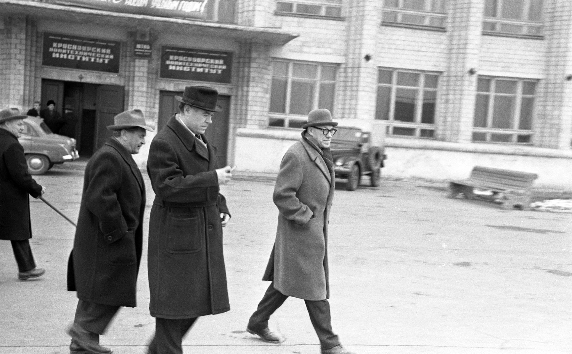 1964 год. Визит председателя Президиума Сибирского отделения Академии наук СССР (СО АН СССР) М.А. Лаврентьева (справа) в Красноярск. Посещение Политехнического института. В центре А.И. Дрокин, заместитель директора Института физики СО АН СССР по научной работе. Красноярск
