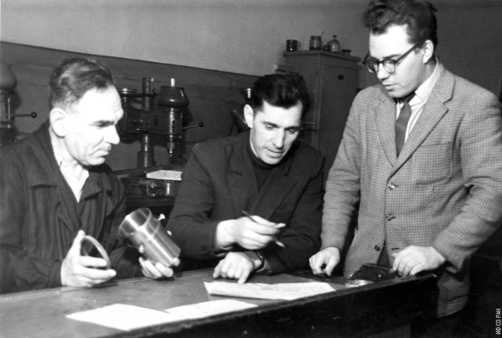 Сибирского отделения Академии наук СССР (ИФ СО АН СССР) идет обсуждение новой конструкции. Слева направо: фрезеровщик Ростовцев П.Г., начальник мастерских Кушнаренко В.А., Буравихин В.А. Фото 1970 года.