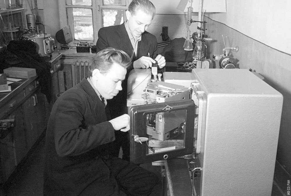 Русецкий Ю.С. (слева) и Бондарев А.Ф., сотрудники лаборатории молекулярной спектроскопии Института физики Сибирского отделения Академии наук СССР (ИФ СО АН СССР), ремонтируют записывающее устройство ДФС-12, фото 1965 года. Красноярск.