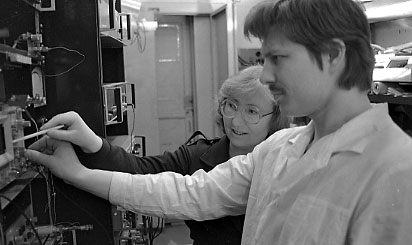 Саблина К. А. и Великанов Д. А., сотрудники лаборатории резонансных свойств магнитоупорядоченных веществ Института физики им. Л.В. Киренского Сибирского отделения Академии наук СССР (ИФ СО АН СССР), у СКВИД- магнитометра. Фото 1990 года. Красноярск.