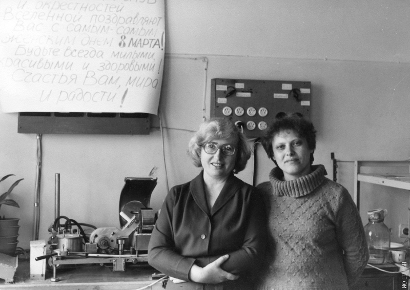 Клара Александровна Саблина (слева) и Евгения Николаевна Агартанова, сотрудники лаборатории резонансных свойств магнитоупорядоченных веществ Института физики им. Л.В. Киренского Сибирского отделения Академии наук СССР (ИФ СО АН СССР). Снимок 1989 года. Красноярск.