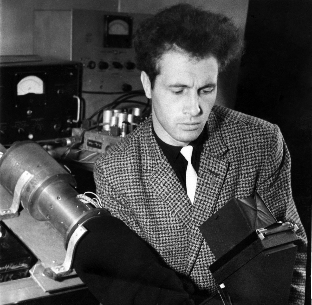 Синегубов Валентин Иванович, младший научный сотрудник лаборатории физики магнитных явлений Института физики Сибирского отделения Академии наук СССР (ИФ СО АН СССР), исследовал структуры доменных границ в тонких магнитных пленках, фото 1962 года. Красноярск.