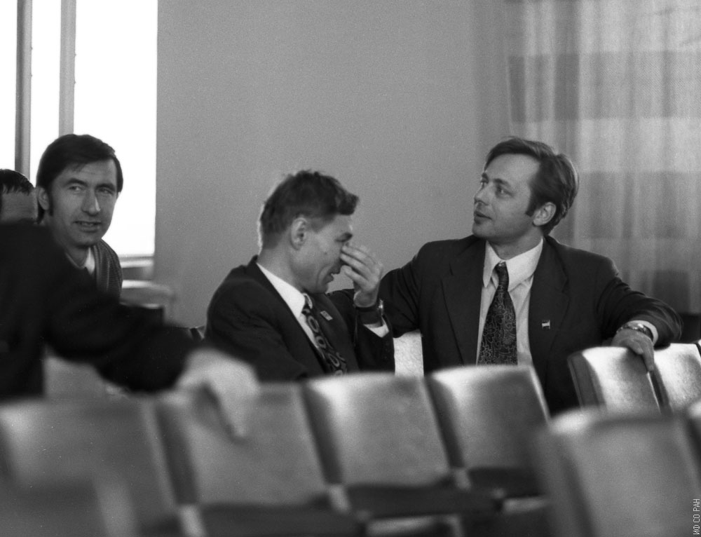 В конференц-зале Института физики им. Л.В. Киренского Сибирского отделения Академии наук СССР на торжественном заседании, посвященном первомайскому празднику. Слева направо: Смокотин Э. М., Анистратов А. Т., Петраковский Г. А. Снимок 1974 года. Красноярск.