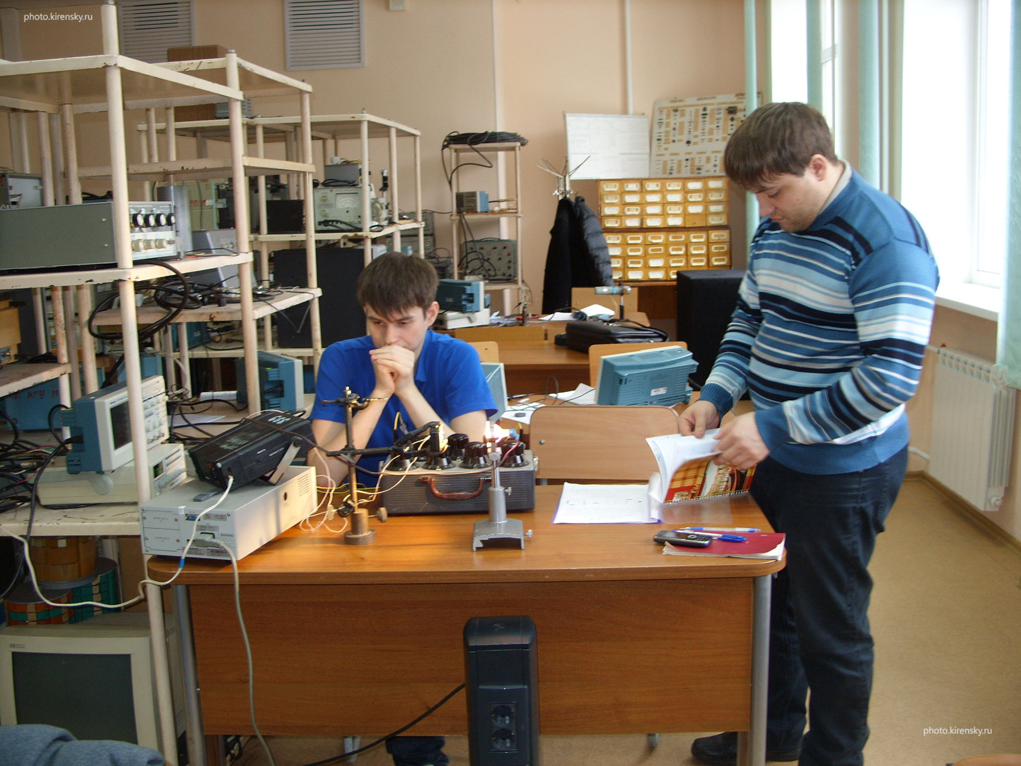 Соколов Валерий Владимирович, студент пятого курса Сибирского федерального университета во время лабораторной работы в 2015 году. С 2013 года он сотрудник лаборатории физики магнитных явлений Института физики им. Л.В. Киренского Сибирского отделения Российской Академии наук, кандидат физико-математических наук.