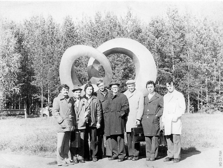 1981 год. Фото на память. Сотрудники лаборатории теории функций у Института физики им. Л.В. Киренского Сибирского отделения Академии наук СССР (ИФ СО АН СССР), слева направо: Мкрчан М.А., Егорычев Г.П., Даутов Ш.А., Болотов В.А., Кытманов А.М., Айзенберг Л.А., Тарханов Н.Н., Цих А.К. Красноярск.