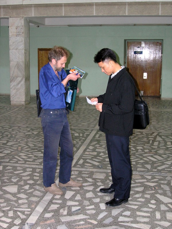 Август 2004 года. Александровский Александр Сергеевич (слева), старший научный сотрудник лаборатории когерентной оптики Института физики СО Российской академии наук (ИФ СО РАН), на Евро-Азиатском симпозиуме «Прогресс в магнетизме» (ЕASTMAG-2004) с сотрудником фирмы «Samsung». Красноярск.