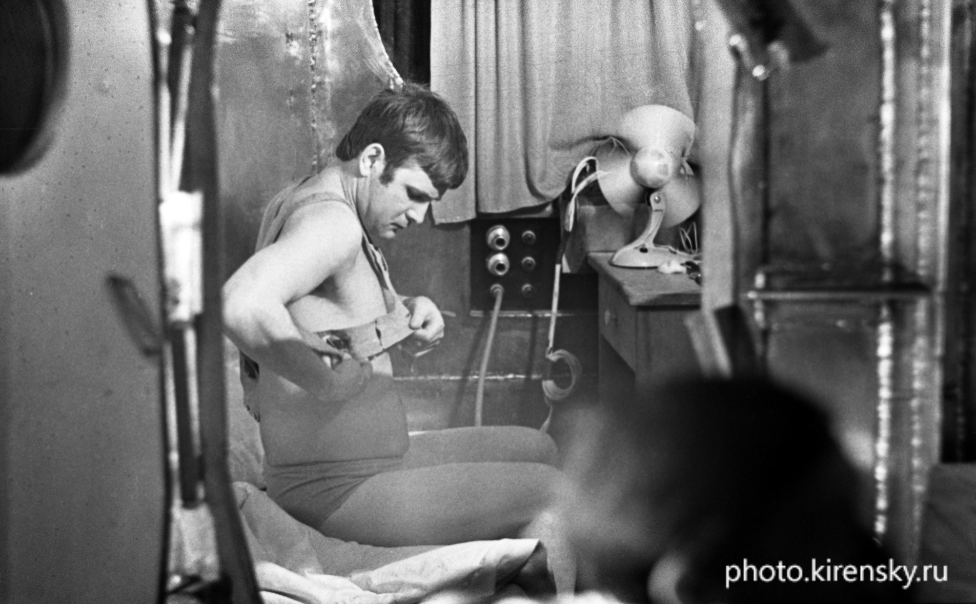 На фото запечатлен момент подготовки ко сну участника шестимесячного эксперимента в «БИОС-3», проведенного в отделе биофизики Института физики им. Л.В. Киренского Сибирского отделения Академии наук СССР (ИФ СО АН СССР) Бугреева Н. И. Фото 1973 года. Фрагмент на видео https://youtu.be/X6XqUOP0nSs?t=181