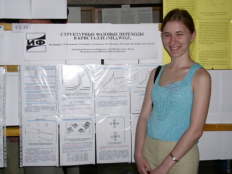 Фокина Валентина Дмитриевна, научный сотрудник лаборатории кристаллофизики Института физики им. Л.В. Киренского Сибирского отделения Российской Академии наук (ИФ СО РАН), у стендового доклада на VIII Всероссийской конференции по физике сегнетоэлектриков, Пенза 2008 год.